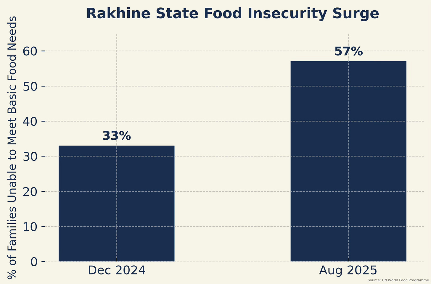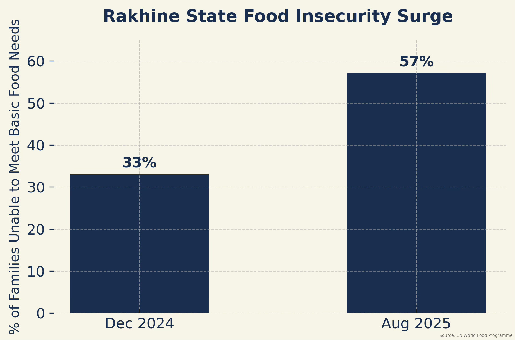 Humanitarian groups say the crisis has worsened after U.S.-led funding freezes, including cuts to the World Food Programme (WFP), which relied on the U.S. for nearly half its 2024 budget. WFP reports that 57% of families in central Rakhine cannot meet basic food needs, up from 33% in December, with conditions in conflict-hit northern areas “much worse.”