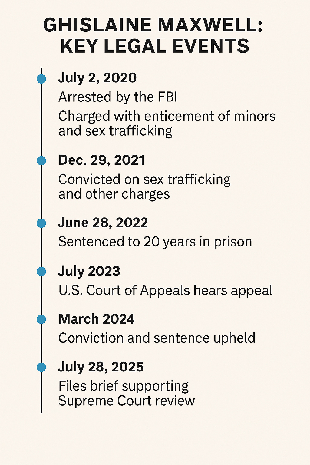 Ghislaine Maxwell has filed a petition with the U.S. Supreme Court seeking to overturn her 2021 conviction for sex trafficking minors alongside Jeffrey Epstein. Her appeal hinges on Epstein’s 2007 plea agreement with the U.S. Attorney’s Office in Florida, which promised not to prosecute unnamed co-conspirators. Maxwell, not explicitly named, argues that the deal should have protected her.
