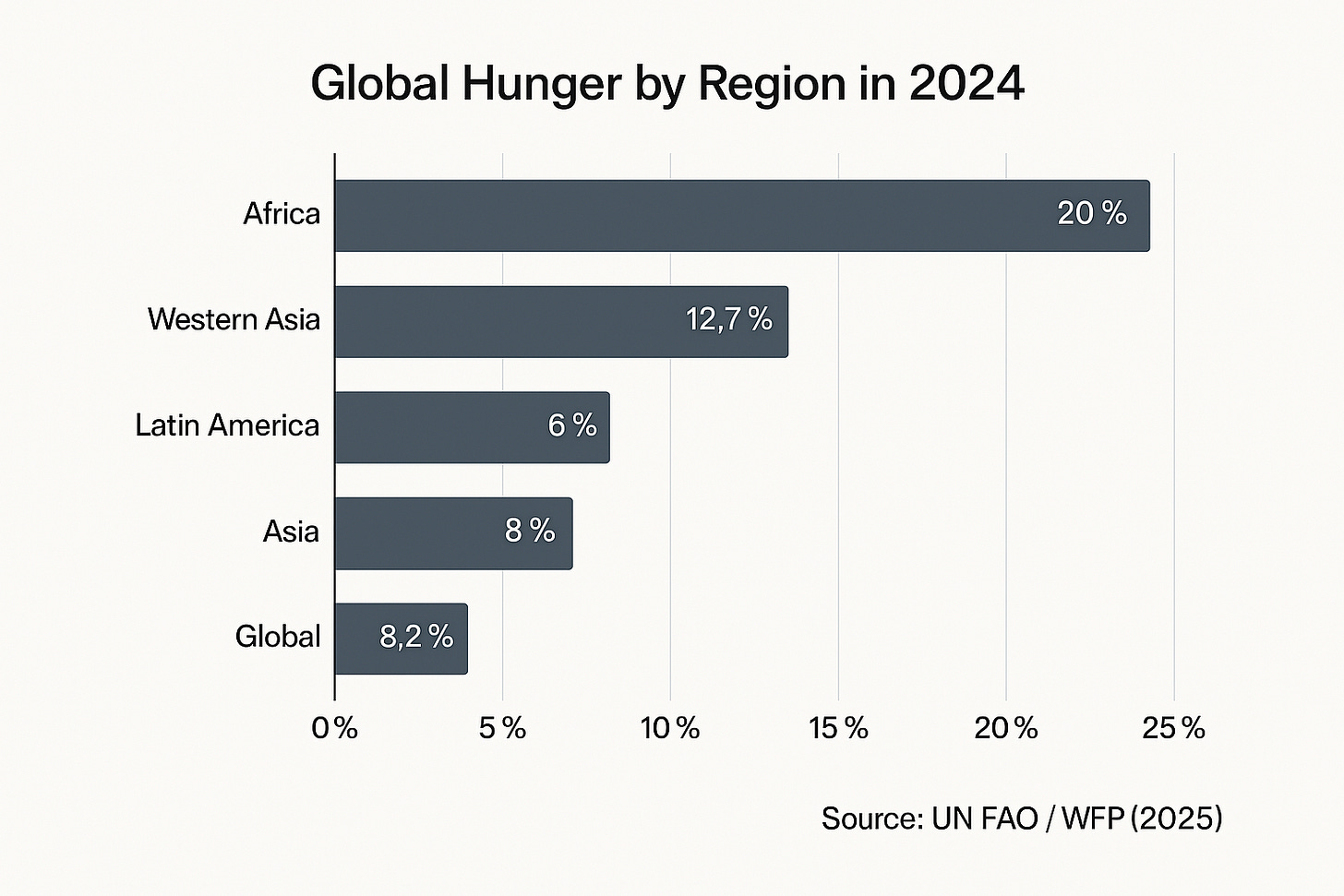 Africa continues to face a worsening crisis, with 20% of its population—over 300 million people—chronically undernourished. The report warns that by 2030, nearly 60% of the world’s hungry may live on the continent. Conflict, climate shocks, and economic instability were cited as key drivers of hunger in regions including Gaza, Sudan, and Western Asia.