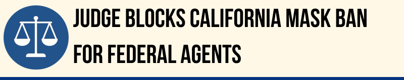 A federal judge on Monday struck down a California law that banned federal immigration agents and other law enforcement officers from wearing masks. U.S. District Judge Christina A. Snyder ruled the No Secret Police Act unlawfully discriminates against federal officers because it exempted state law enforcement. She said federal officers can perform their federal functions without wearing masks, and indicated a revised law that applies equally may be constitutional.