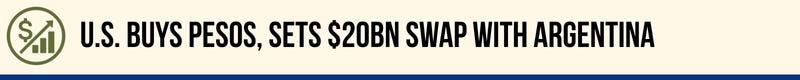 The U.S. Treasury intervened in Argentina’s currency market, with Secretary Scott Bessent saying the department “directly purchased Argentine pesos” to support the currency after reserves were rapidly depleted. He added that Washington has finalised a $20bn currency swap framework with Argentina’s central bank, calling Milei’s reform programme “of systemic importance.” The move is highly unusual; the U.S. has intervened in FX markets only three times since 1996.