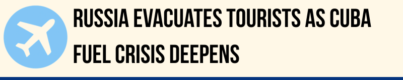 Russia has begun evacuating tourists from Cuba after a severe fuel shortage disrupted aviation operations and forced airlines to suspend flights. Authorities said Russian carriers would operate return-only services from Havana and other destinations because refuelling aircraft on the island had become difficult.