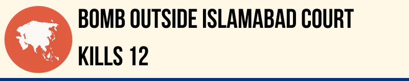 At least 12 people were killed and 27 wounded when an attacker detonated a bomb at the entrance of a district court complex in Islamabad at around midday; authorities said the bomber had tried and failed to enter the courthouse and died at the scene. The blast, the first major assault on the capital in more than a decade, threw hundreds of lawyers and litigants into chaos and prompted emergency evacuations.