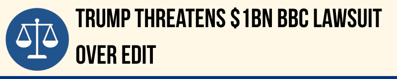 US President Donald Trump says he has an “obligation” to sue the BBC for $1bn over an edited clip of his 6 January 2021 speech used in a Panorama film. He told Fox News the edit “defrauded the public”, following a legal letter demanding a retraction, apology and compensation by Friday. The BBC chair has apologised for an “error of judgement” over the edit; the corporation says it will respond in due course.