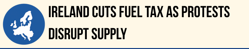Ireland announced a €505 million package of fuel-cost measures after days of protests disrupted distribution sites, blocked major roads and strained supply across the country. Micheál Martin said the government would extend temporary excise-duty cuts on petrol, diesel and marked gas oil, postpone a carbon tax increase, and introduce a fuel subsidy scheme for farmers and fisheries.