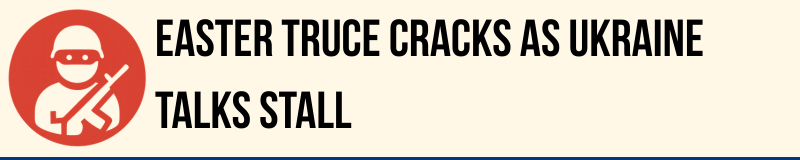 Russia and Ukraine accused each other of breaching a 32-hour Orthodox Easter ceasefire, underlining how little the pause changed conditions on the ground. Ukraine’s military said that by 7am on 12 April it had recorded 2,299 violations, including 28 assaults, 479 shellings and 1,792 explosive-drone strikes, while Russia’s defence ministry claimed nearly 2,000 Ukrainian breaches.