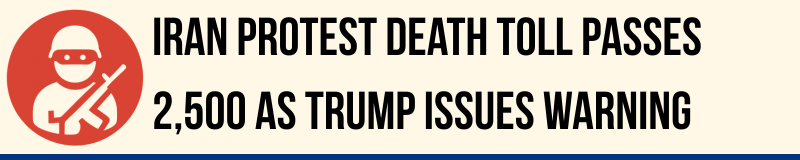 Human rights groups say more than 2,500 people have been killed in Iran during a security-force crackdown on nationwide protests that began in late December over the collapsing currency and rising living costs. The US-based Human Rights Activists News Agency reports at least 2,571 deaths, including protesters, government-affiliated personnel, children and civilians not involved in demonstrations. An Iranian official separately told Reuters about 2,000 had died, blaming “terrorists”. Activists say the true figure is likely higher amid a near-total internet shutdown.