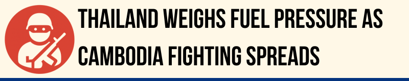 Thailand’s military said it is considering blocking fuel exports to Cambodia, including asking the navy to be vigilant against ships carrying strategic supplies and designating maritime zones near Cambodian ports as high-risk. The discussion comes as fighting spread to coastal areas of a disputed border region two days after President Donald Trump said the sides had agreed to a new ceasefire.