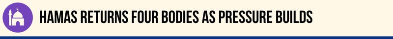 Hamas has returned four more bodies of Israeli hostages, the military said, with identification under way. The Red Cross retrieved the remains in coffins and handed them to the Israel Defense Forces. The handover follows an earlier transfer in which four deceased and 20 living hostages were returned, bringing the total number of bodies repatriated under this week’s ceasefire to eight.