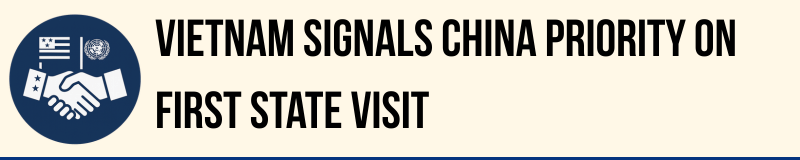 Vietnam’s new president To Lam used his first overseas trip to underline Beijing’s importance, meeting Chinese President Xi Jinping in Beijing and calling relations with China a strategic choice and top priority. Xi urged stronger infrastructure links and deeper cooperation in areas including artificial intelligence and semiconductors, while both sides attended a signing ceremony for cooperation documents. The trip was seen as a sign of the importance Hanoi places on the relationship.