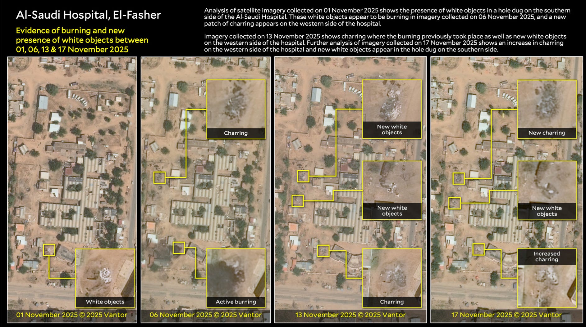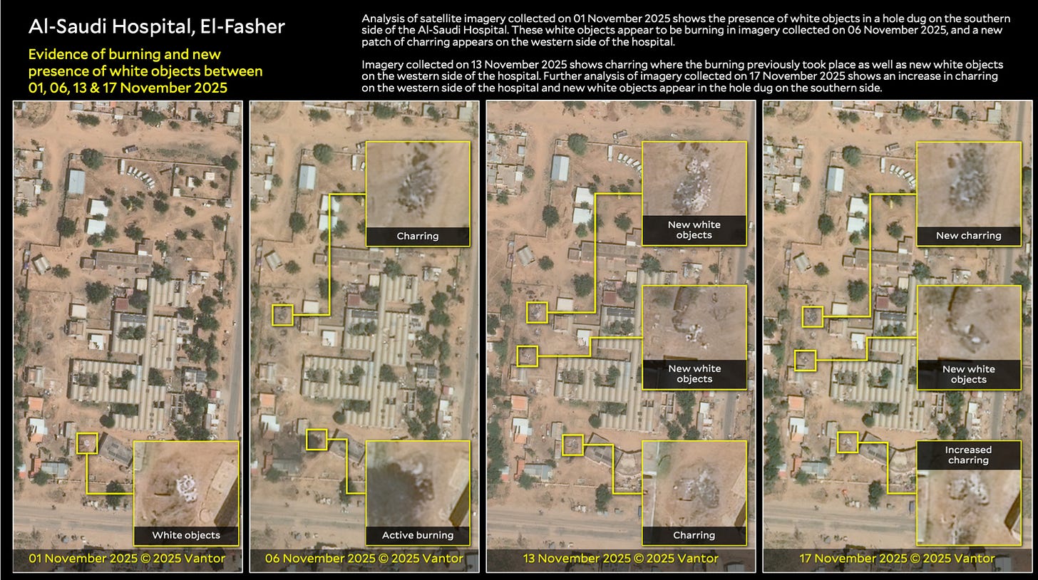 Satellite analysis suggests Sudan’s Rapid Support Forces attempted to conceal mass killings in el-Fasher by burying and burning bodies after seizing the city in October, according to a report by Yale University’s Humanitarian Research Lab. Researchers say imagery shows clusters consistent with human remains shrinking or disappearing over weeks, indicating a sustained effort to destroy evidence.