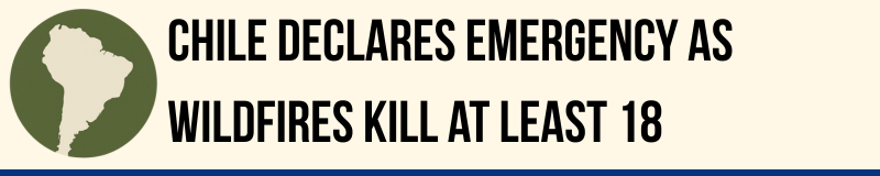 Chile’s President Gabriel Boric declared a state of catastrophe in the Ñuble and Biobío regions as wildfires left at least 18 people dead and forced large-scale evacuations. More than 50,000 people were evacuated, with many leaving the cities of Penco and Lirquen near the coastal city of Concepción. Disaster agencies said at least 250 homes have been destroyed, and local media showed pictures of charred cars in the streets.