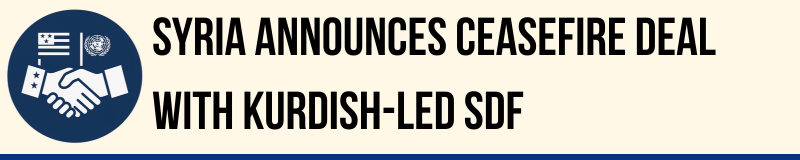 Syria’s government has announced a ceasefire agreement with the Syrian Democratic Forces, setting out a handover of SDF-held areas and the integration of its forces into state structures. Syrian President Ahmed al-Sharaa said state institutions would move into al-Hasakah, Deir Az Zor and Raqqa, while the SDF would withdraw from areas west of the Euphrates River. SDF leader Mazloum Abdi confirmed in a video statement that the group accepted the agreement, including withdrawal from Raqqa and Deir el-Zour provinces.