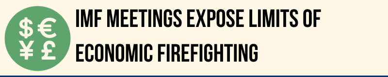 Yet participants acknowledged the decisive developments were unfolding outside Washington. The IMF said its 2026 global growth forecast of 3.1% was already outdated and that the world economy was drifting towards a more adverse 2.5% scenario, with prolonged war carrying recession risk.