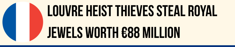 French prosecutors say jewellery stolen from the Louvre in a daring daylight robbery is worth €88 million, or just over $100 million. The eight pieces, which include royal necklaces, earrings and a tiara worn by Empress Eugénie, were taken from the museum’s Apollo Gallery on Sunday morning in under eight minutes.