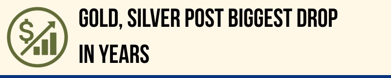Gold and silver posted their steepest selloff in years as investors took profits after a record-breaking rally. Spot gold fell as much as 6.3% and silver 8.7%, with gold down about 5% to roughly $4,125 by late afternoon. Analysts described a technical correction after trend-driven gains, with profit-taking amplified by a stronger dollar.
