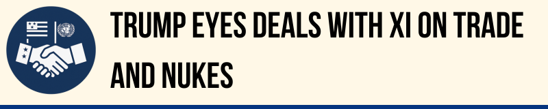 Ahead of the encounter, Treasury Secretary Scott Bessent and Trade Representative Jamieson Greer are travelling to Asia to address Beijing’s rare-earth export curbs, which Trump called a “disturbance”, arguing tariffs are “more powerful”.