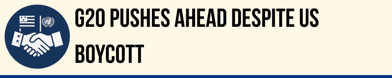 The G20 summit in Johannesburg closed with an unusual show of unity, as leaders issued a joint declaration without US participation. South Africa said the gathering was a success despite Washington’s boycott, which followed Trump’s false claims about land seizures and objections to the summit’s DEI agenda. As a result, Ramaphosa announced consensus at the opening session and released the declaration without US input.