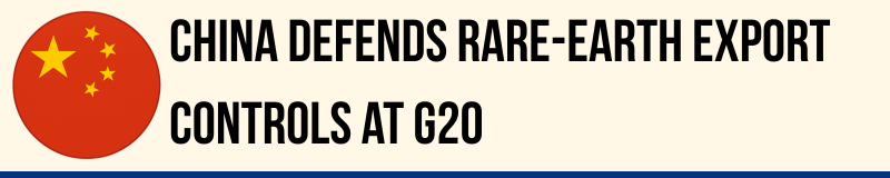 China used the G20 summit to justify strict export controls on minerals with military applications, arguing that sensitive resources must be “cautiously managed.” Premier Li Qiang defended measures that have disrupted access for European and Japanese manufacturers, as leaders from both regions pressed Beijing over tightening supply conditions. The G20’s joint declaration had already criticised “unilateral trade actions” that restrict access to critical minerals, underscoring how contested the issue has become.