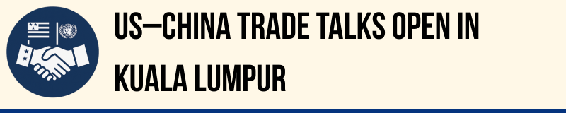 Senior U.S. and Chinese officials are meeting in Kuala Lumpur from 24–27 October to defuse escalating trade tensions and keep a planned Trump–Xi encounter on track. U.S. Treasury Secretary Scott Bessent and Trade Representative Jamieson Greer are due to meet Vice-Premier He Lifeng from 25 October on the ASEAN Summit sidelines, after Washington threatened 100% tariffs from 1 November in response to China’s expanded export controls on rare earths.