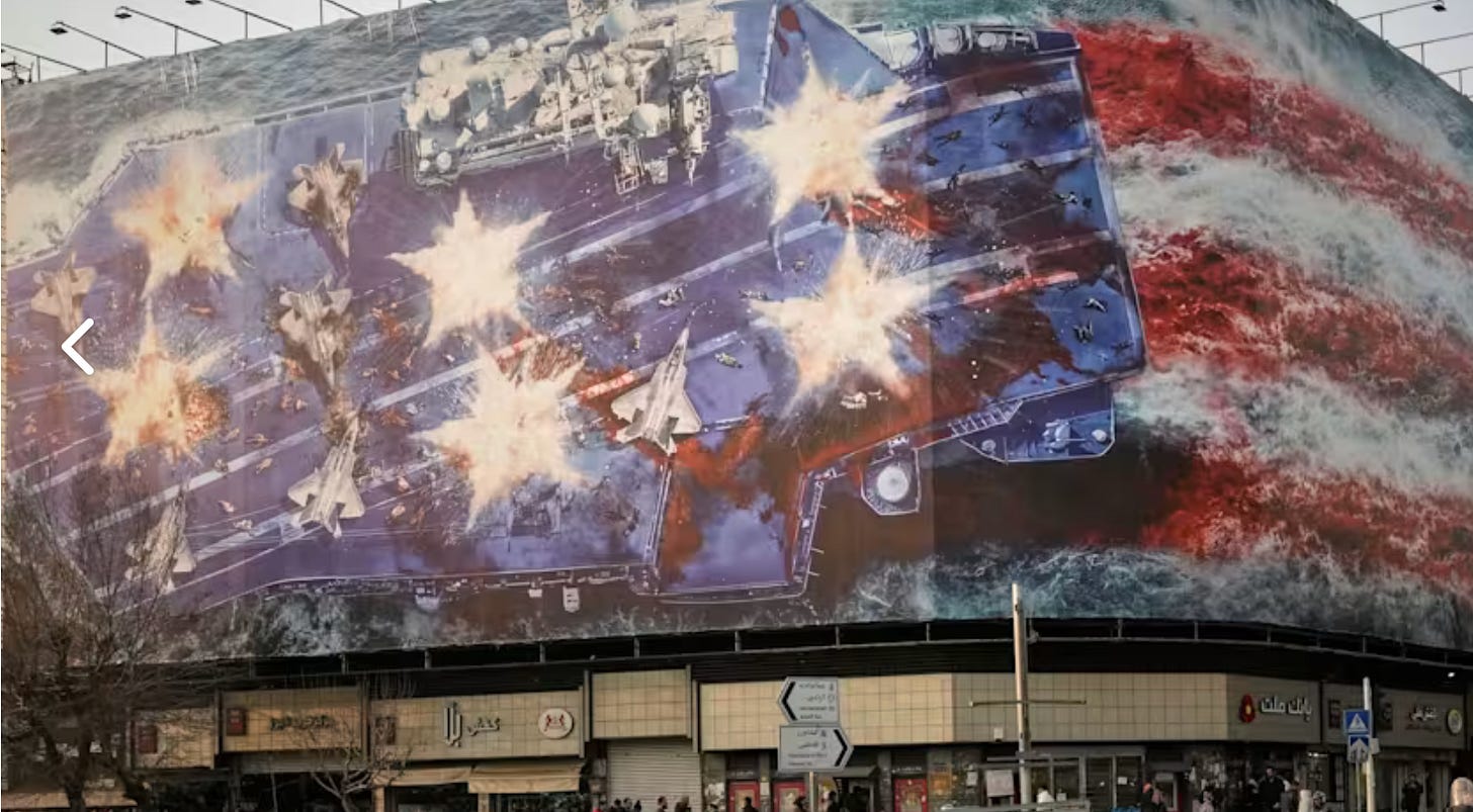 Iranian authorities unveiled a new mural on a giant billboard in Enghelab Square in Tehran on Sunday, warning the United States not to attempt a military strike as US warships head to the region. The image depicts a damaged aircraft carrier with exploding fighter planes and the slogan, “If you sow the wind, you will reap the whirlwind.”