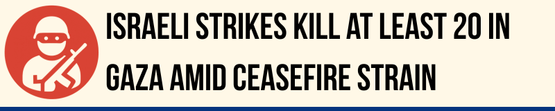 Israeli strikes in Gaza have killed at least 20 Palestinians, including several children and a paramedic, according to hospital officials, as violence continues despite a three-month-old ceasefire. Nearly 40 others were reported wounded. The Israeli military said its forces carried out precise strikes after gunfire seriously wounded an officer near the Yellow Line, calling the incident a violation of the ceasefire.