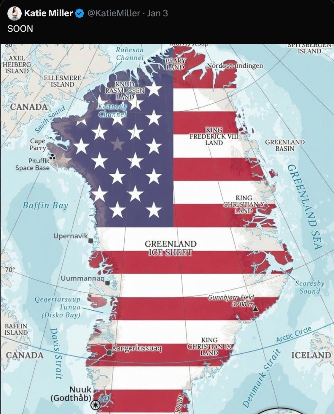 Greenland’s Prime Minister Jens-Frederik Nielsen said linking Greenland to Venezuela and military intervention was “disrespectful,” after an X post by Katie Miller, wife of Stephen Miller, Deputy White House Chief of Staff and National Security Adviser showed a US-flag map captioned “SOON”.