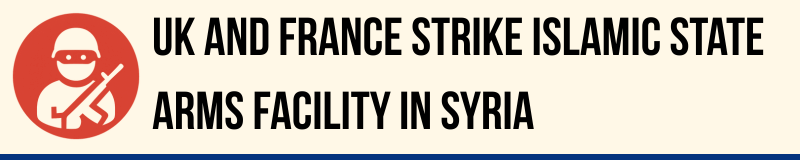 British and French aircraft carried out a joint air strike on an underground arms bunker used by Islamic State in central Syria, according to the UK Ministry of Defence. Royal Air Force Typhoon jets targeted access tunnels to the facility, located in mountainous terrain north of Palmyra, using Paveway IV guided bombs after what officials described as careful intelligence analysis.