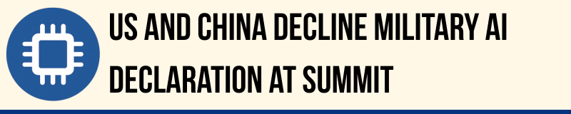 The United States and China declined to sign a declaration on the military use of artificial intelligence at a summit in Spain, highlighting divisions among major powers over how the technology should be governed. Only 35 of the 85 states attending the Responsible AI in the Military Domain meeting endorsed the non-binding principles.