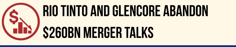 Rio Tinto and Glencore have abandoned plans for a $260bn merger that would have created the world’s largest mining group, ending more than 18 months of intermittent talks. Both companies said they failed to reach agreement before a regulatory deadline, citing differences over valuation and governance.