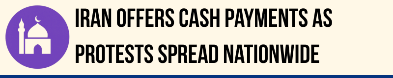 Iran’s government has announced monthly payments of around seven dollars (US$) to most citizens in an attempt to ease economic pressures driving protests across the country. Officials said the payments are intended to preserve purchasing power, control inflation and ensure food security, but critics argue the sums are too small to address the depth of the crisis.
